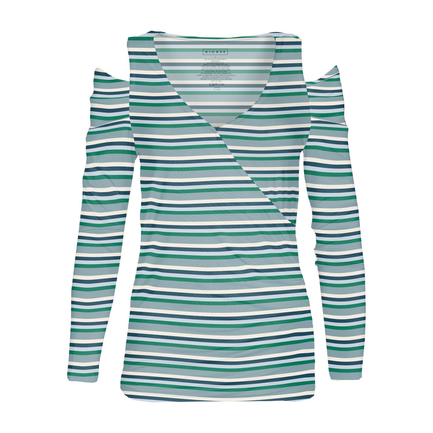 Women's Print Long Sleeve Open-Shoulder Kimono Tee in Stormy Sea Stripe